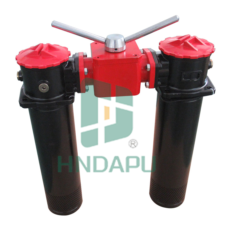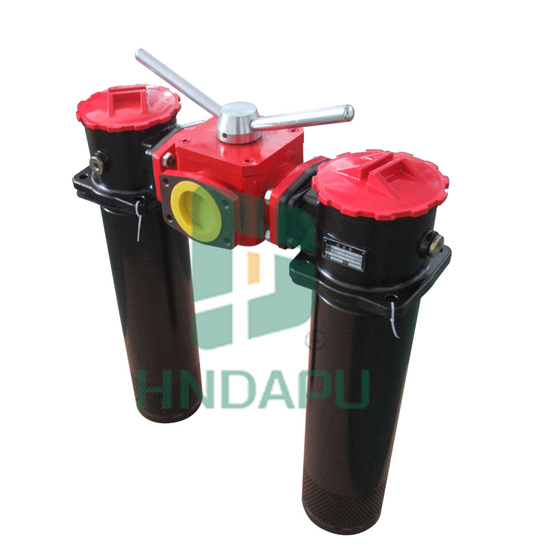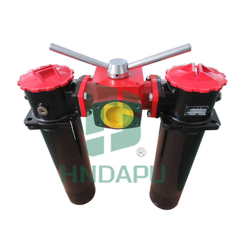 該過(guò)濾器是有兩只單筒過(guò)濾器,換向閥,旁通閥,發(fā)訊器,擴(kuò)散器等組成。它被安裝在油箱頂部,可在系統(tǒng)不停機(jī)的情況下更換濾芯,適用于連續(xù)工作的液壓系統(tǒng)回油精過(guò)濾,用來(lái)濾除系統(tǒng)中諸元件磨損產(chǎn)生的金屬。當(dāng)一只過(guò)濾器的濾芯堵塞致使進(jìn)出油口壓差達(dá)到 0.35MPa 時(shí),發(fā)訊器發(fā)訊,這時(shí)轉(zhuǎn)動(dòng)換向閥,使備用濾油器工作,然后更換已堵塞的濾芯。連接方式分為螺紋和法蘭接口。